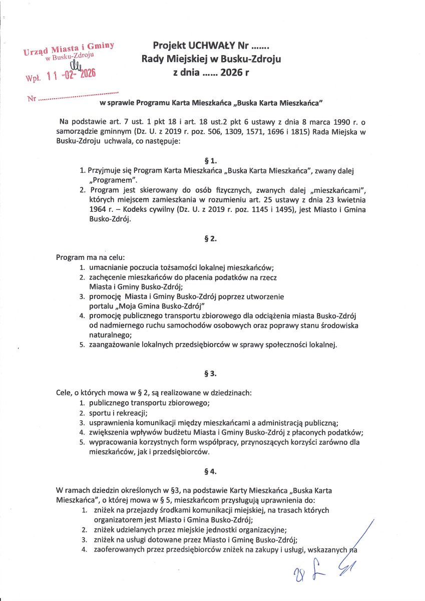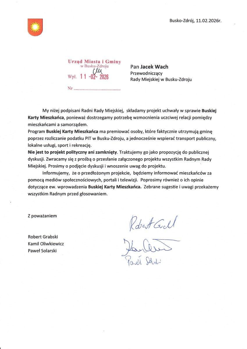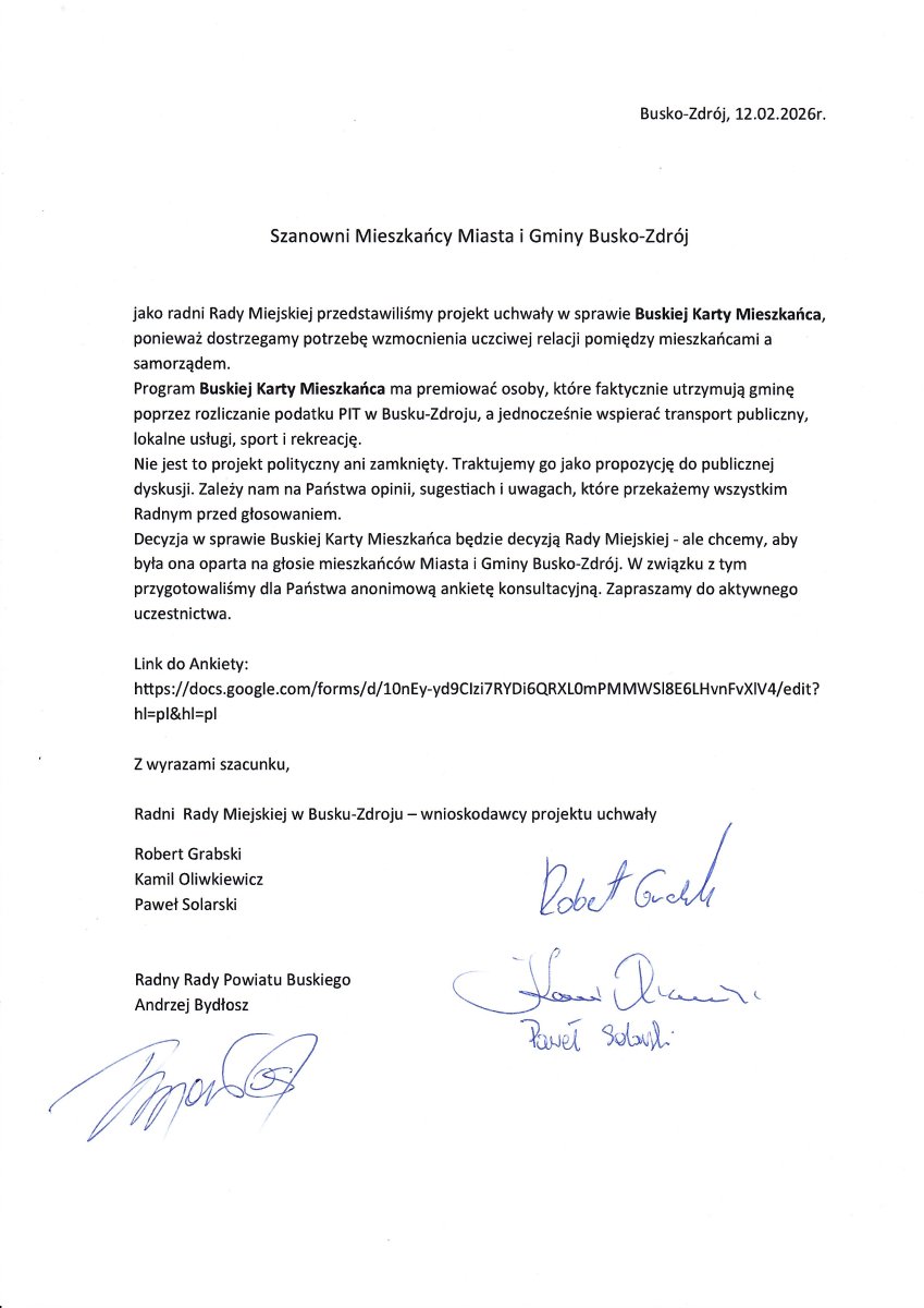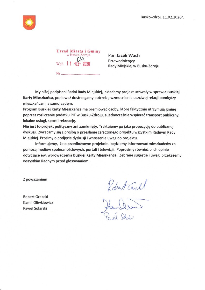 jako radni Rady Miejskiej przedstawiliśmy projekt uchwały w sprawie Buskiej Karty Mieszkańca, ponieważ dostrzegamy potrzebę wzmocnienia uczciwej relacji pomiędzy mieszkańcami a samorządem.