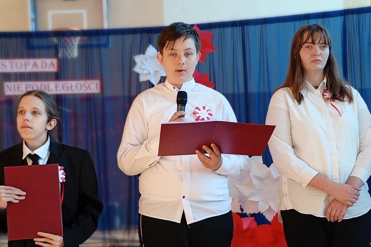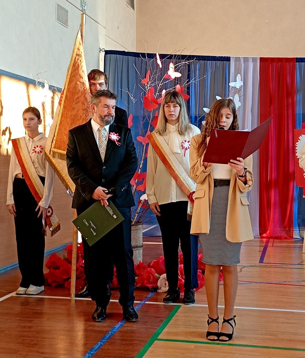 Uroczystość rozpoczęła się o godz. 10:35 w sali gimnastycznej Ośrodka udekorowanej biało-czerwonymi barwami. Po wprowadzeniu pocztu sztandarowego głos zabrali pani dyrektor Ewa Tomala oraz nauczyciel historii pan Wojciech Kuźmiński, podkreślając znaczenie tego dnia dla Polaków oraz zachęcił uczniów do pielęgnowania patriotyzmu na co dzień.