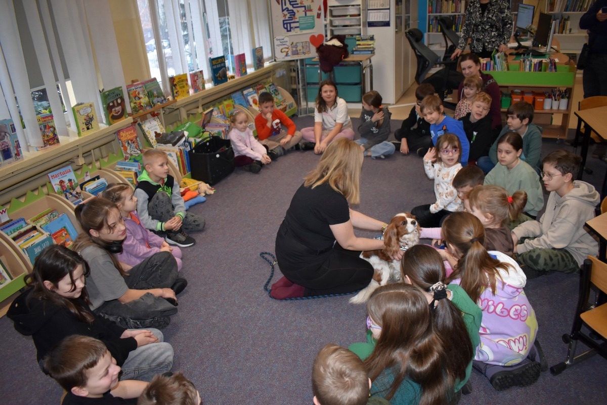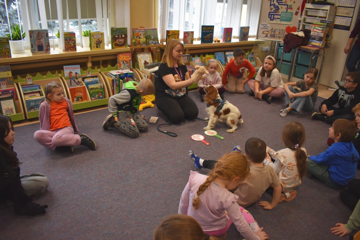 Zajęcia poprowadziła Anna Ciach, specjalistka w dziedzinie dogoterapii. W przystępny i angażujący sposób opowiadała o szkoleniu psów terapeutycznych, zasadach ich pracy oraz o tym, w jaki sposób kontakt ze zwierzęciem może wpływać na emocje, relacje i poczucie bezpieczeństwa. Spotkanie miało nie tylko walor edukacyjny, ale było także ważną lekcją empatii, odpowiedzialności i właściwego podejścia do zwierząt.