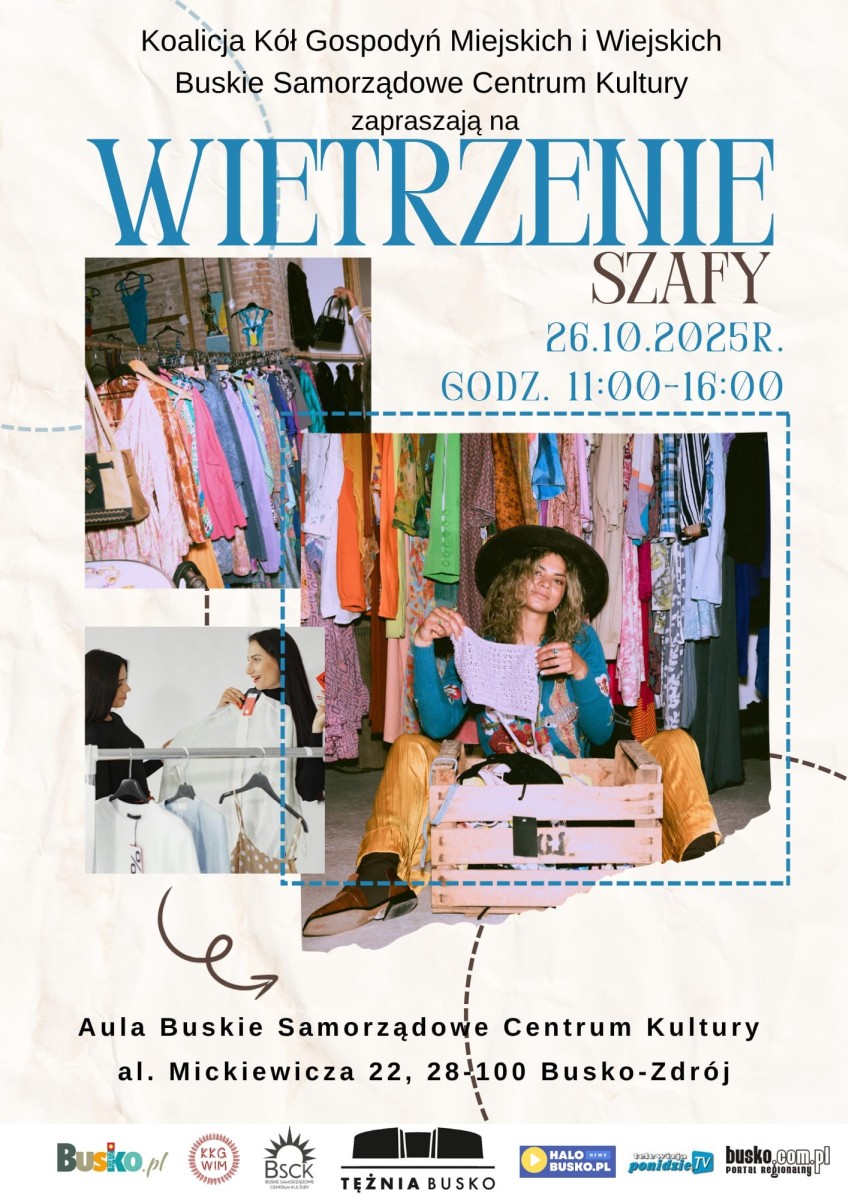 Koalicja Kół Gospodyń Miejskich i Wiejskich oraz Buskie Samorządowe Centrum Kultury zapraszają na wydarzenie pod nazwą 'Wietrzenie Szafy', które odbędzie się w niedzielę, 26 października 2025 roku, w godzinach 11:00-16:00 w auli Buskiego Samorządowego Centrum Kultury przy al. Mickiewicza 22 w Busku-Zdroju.