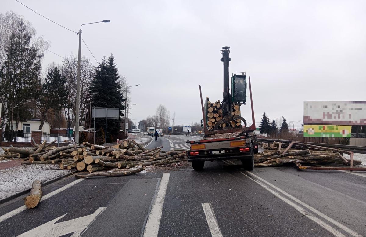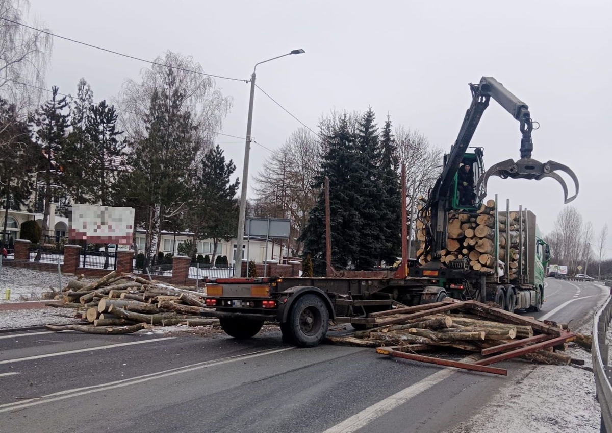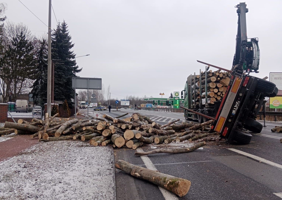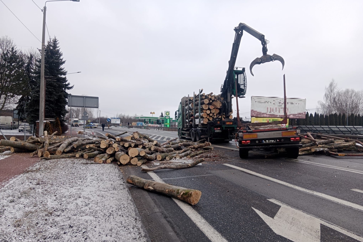 Przewożone drewno rozsypało się na jezdni, całkowicie blokując przejazd drogą krajową. Na miejscu prowadzone są działania związane z usuwaniem drewna i przywróceniem przejezdności trasy.