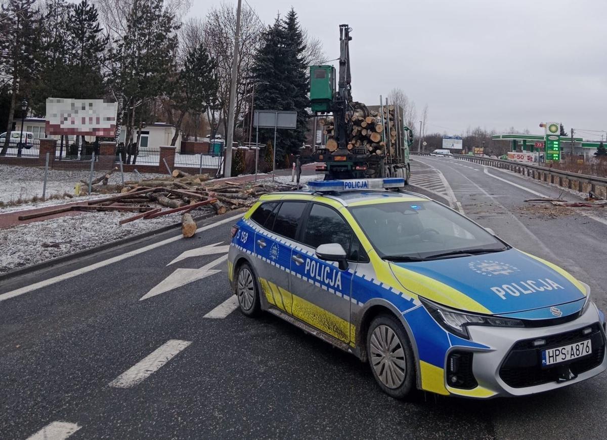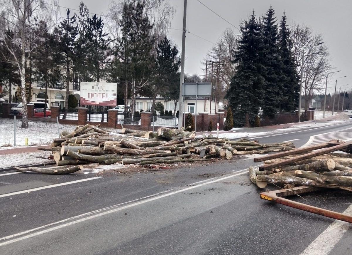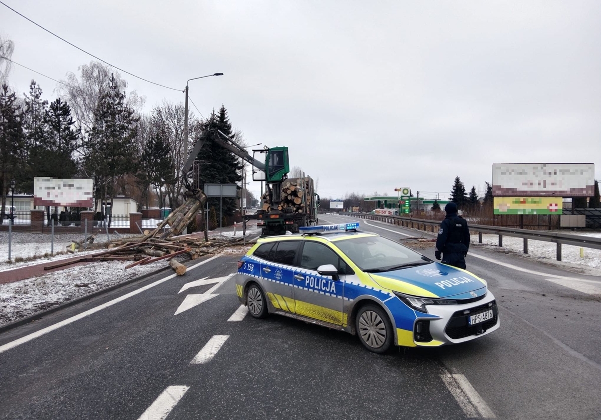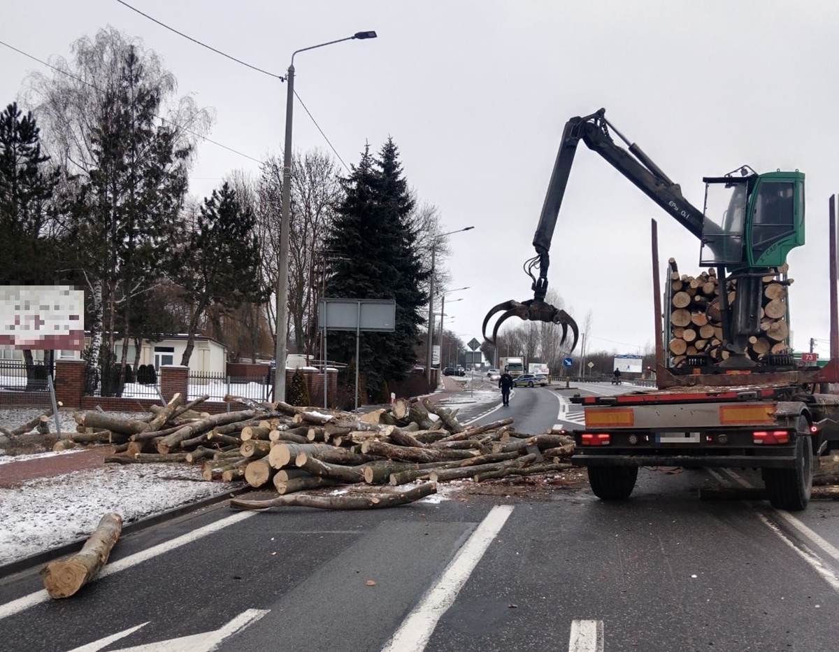 Przewożone drewno rozsypało się na jezdni, całkowicie blokując przejazd drogą krajową. Na miejscu prowadzone są działania związane z usuwaniem drewna i przywróceniem przejezdności trasy.