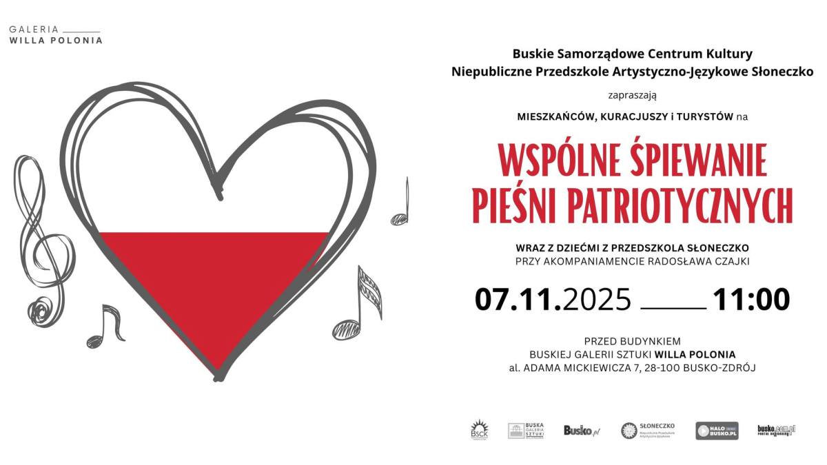 Buskie Samorządowe Centrum Kultury oraz Niepubliczne Przedszkole Artystyczno-Językowe 'Słoneczko' zapraszają mieszkańców, kuracjuszy i turystów na wspólne śpiewanie pieśni patriotycznych, które odbędzie się w piątek, 7 listopada, o godzinie 11:00 przed Buską Galerią Sztuki - Willa Polonia.