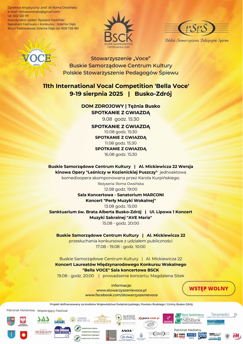- 19 sierpnia, godz. 20:00 – Koncert Laureatów Międzynarodowego Konkursu Wokalnego „Bella Voce” w sali koncertowej Buskiego Samorządowego Centrum Kultury.